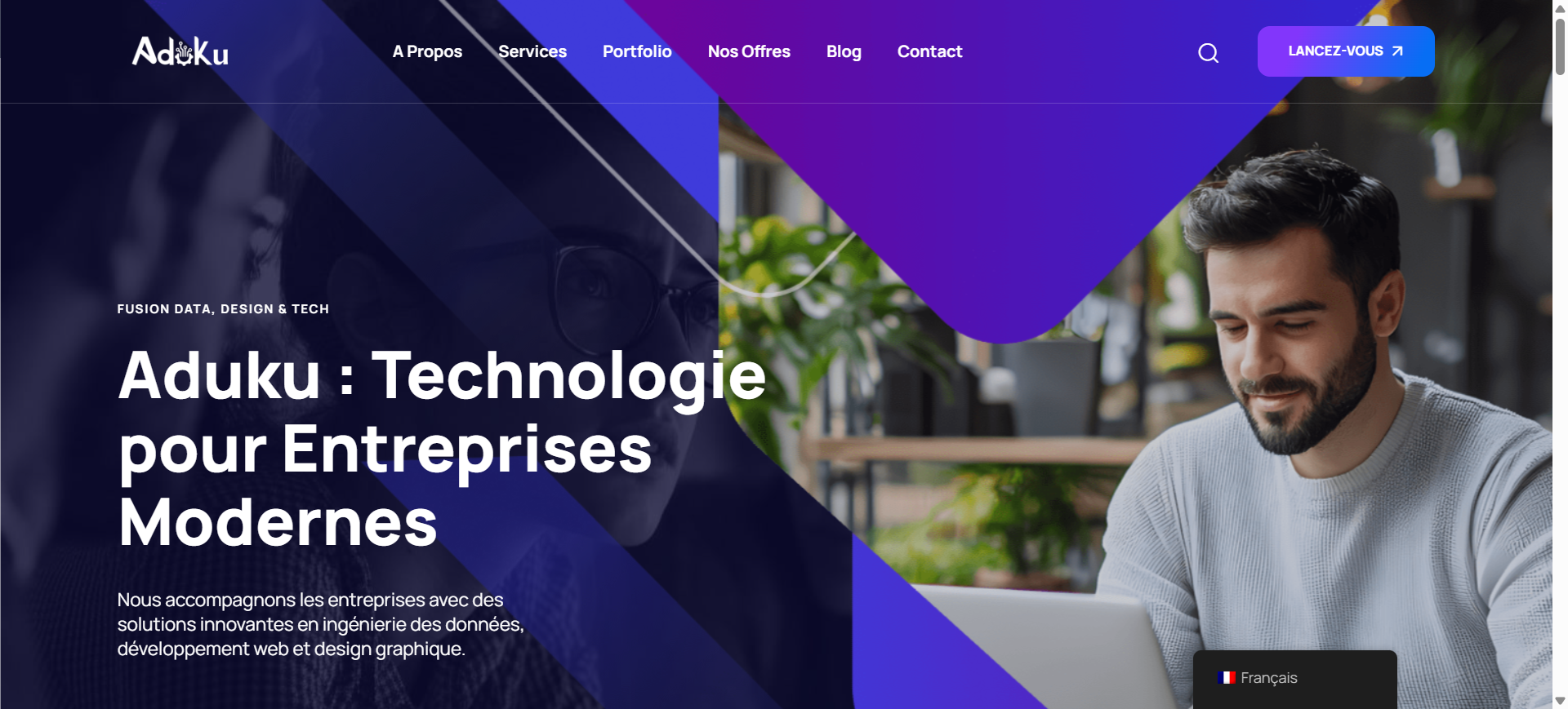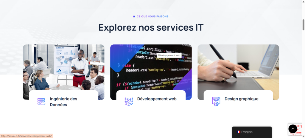Plateforme responsive mettant en avant le développement web, le design graphique et la data science.